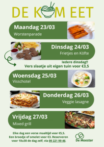 Elke dag maakt de “Kom Eet” een warme maaltijd, wekelijks is er een nieuw menu. Dagelijks zijn er ook broodjes (aanbod afhankelijk van voorraad) en soep verkrijgbaar. Reserveer je maaltijd voor 10u30 op de dag zelf.